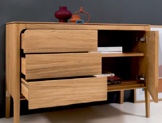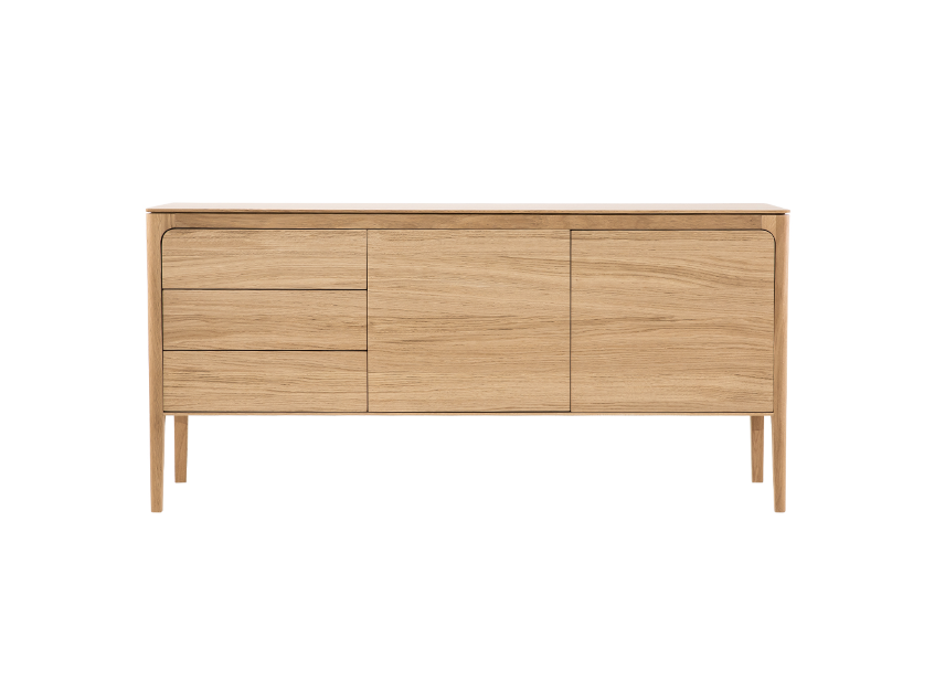 Stylowa i solidna komoda wykonana w 100% z litego drewna dębowego. Prosta forma z delikatnie zaokrąglonymi krawędziami sprawia, że doskonale pasuje zarówno do nowoczesnych, jak i klasycznych wnętrz. Trzy pojemne szuflady i dwie przestronne szafki oferują funkcjonalną przestrzeń do przechowywania. Naturalne wykończenie podkreśla szlachetny rysunek drewna.