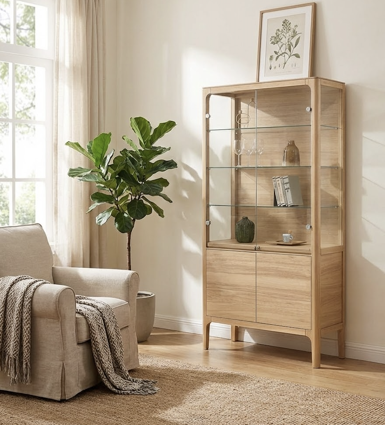 Nowoczesna witryna wykonana z naturalnego litego drewna dębowego, z subtelnie zaokrąglonymi krawędziami i przeszklonym frontem oraz bokami. Trzy półki ze szkła hartowanego idealnie eksponują szkło, ceramikę lub dekoracje, a dolna, zamykana część zapewnia miejsce na mniej reprezentacyjne przedmioty. Witryna świetnie sprawdzi się zarówno w salonie, jak i w jadalni – jako elegancki mebel ekspozycyjno-przechowujący.